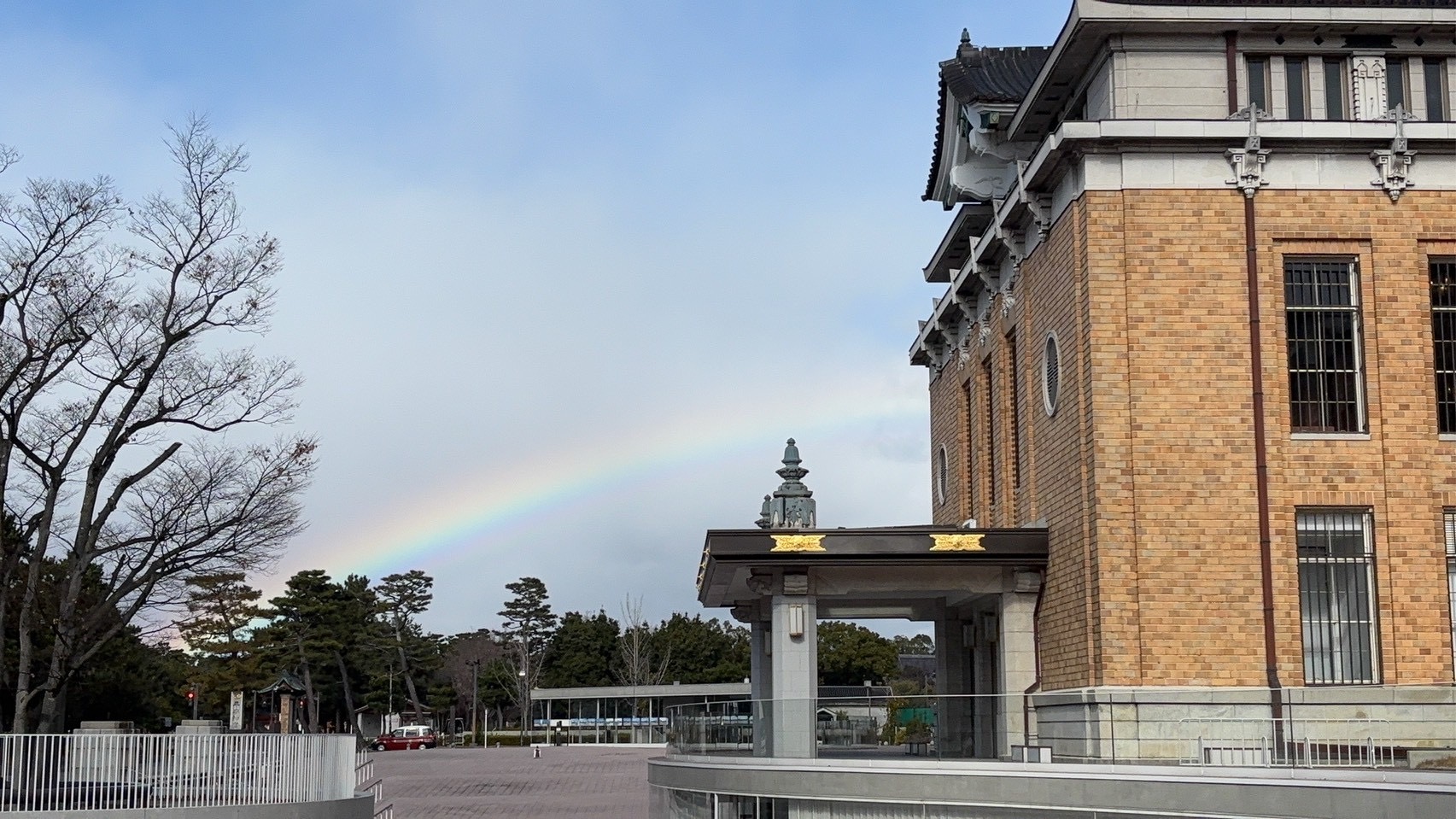上記写真は先月、娘のフォトウエディングで京都の美術館前で写真を撮る前に虹が出ていて